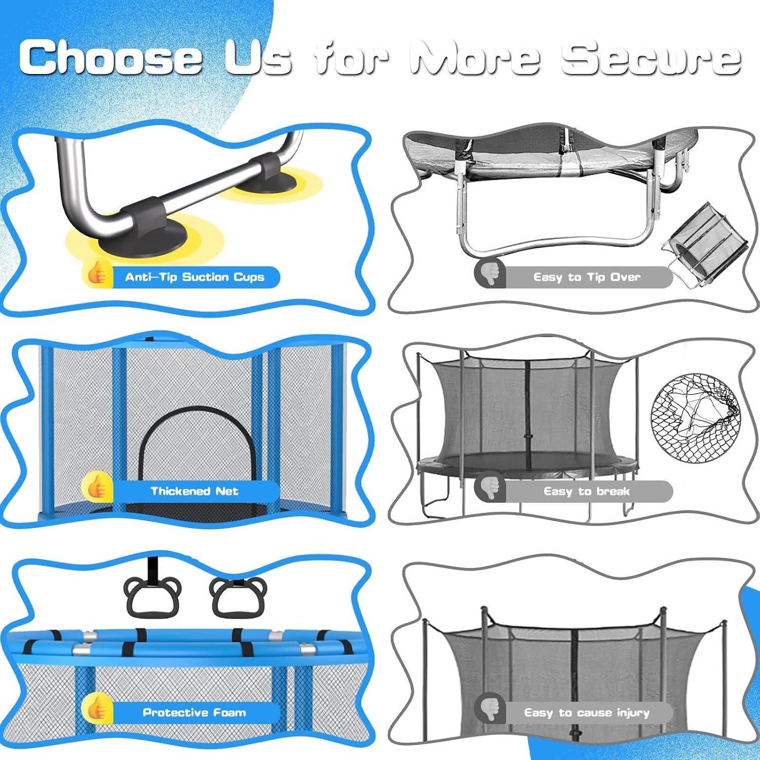 Designed for safety and fun, the trampoline features silent suction pads on each U-shaped tube, ensuring stability and preventing tipping. The trampoline’s vibrant colors and robust structure make it an eye-catching addition to any backyard.